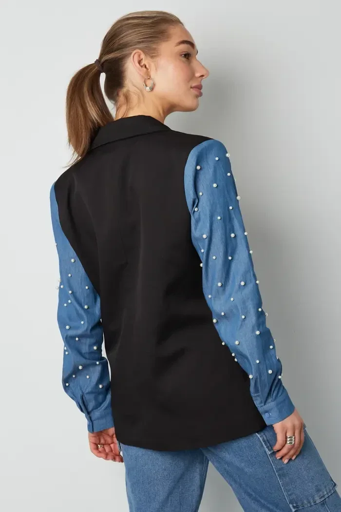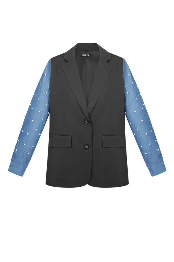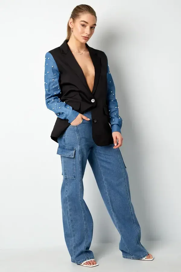 - Met deze blazer ben je hellemaal in, met zijn denim mouwen en afgewerkt met parels.